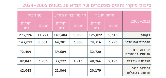 הרשות הממשלתית להתחדשות עירונית העניקה לתמ"א 38 פרק צר יחסית בדו"ח סיכום השנה שלה - וטוב שכך. את הנתונים כדאי להסתיר: ב-20 השנים האחרונות, כלומר בין 2005-2024, הוגשו יותר מ-11 אלף בקשות להיתרי בנייה של תמ"א 38, הונפקו כ-6,300 היתרים אך בפועל אוכלסו כ-3,900 מבנים.
