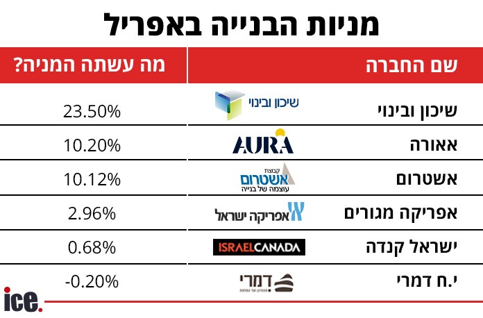 ברבעון הראשון של השנה, מניות 6 חברות הבנייה הגדולות רשמו ירידה משמעותית. החברות שבדקנו גם באפריל: י.ח דמרי, אפריקה מגורים, אשטרום, ישראל קנדה, אאורה ושיכון ובינוי. אשטרום נכללת במדד הזה כי היא אשטרום נכסים מחזיקה נכסים מניבים בארץ ובחו"ל (קניונים, בנייני משרדים), אשטרום גרופ מחזיקה גם בנתחים ביזמות, השקעות תשתית ועוד. זרוע הקבלנות קיימת והיא חלק מהקבוצה.