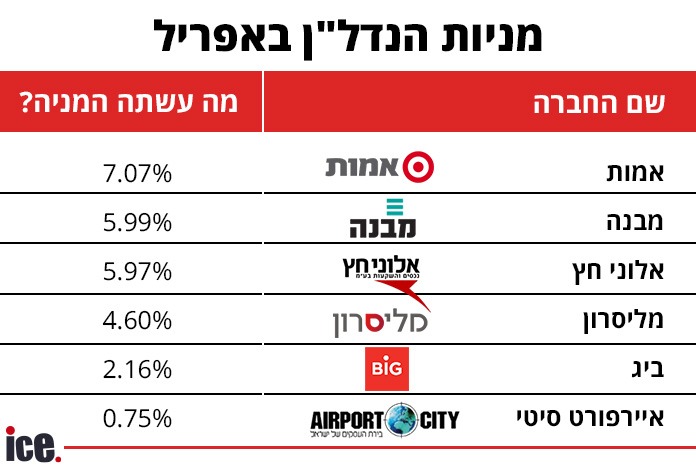 הנה מה שקרה באפריל למניות של 6 חברות הנדל"ן הגדולות (לקחנו את חברות הנדל"ן שיש להם את החלק הגבוה ביותר במדד). החברות שבדקנו: ביג (תראו מה קרה לה בחודש שעבר), אלוני חץ, מבנה, מליסרון, איירפורט סיטי ואמות. חברת ביג פתחה לאחרונה את המרכז המסחרי הענק בגלילות והיא מתחילה לאיים על מליסרון, שמדורגת אחרי עזריאלי בשליטה על הנדל"ן המניב. הנה התוצאות: