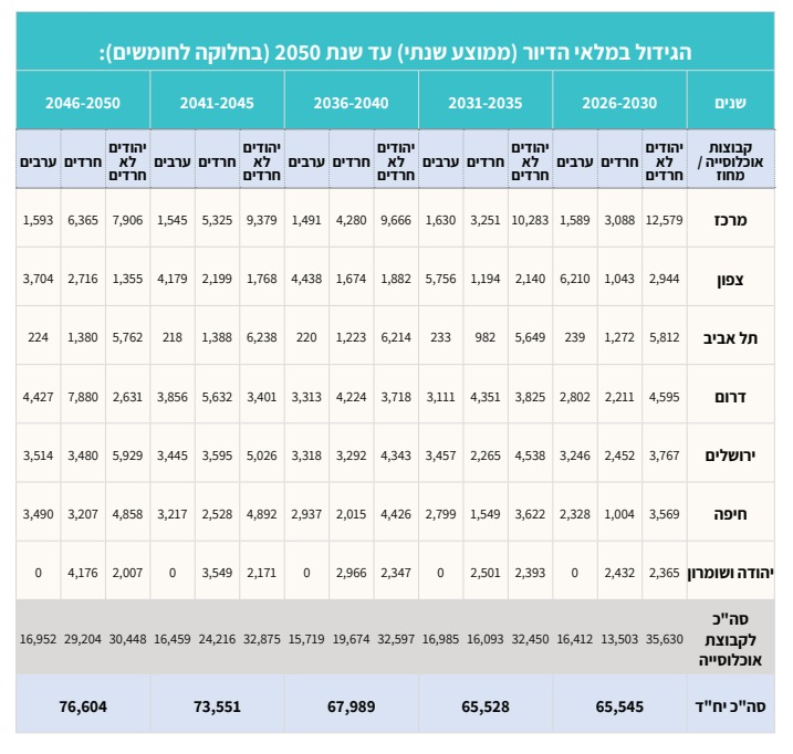 בטבלה שלפניכם, שמסכנת את הגידול הרצוי במלאי הדיור בממוצע לשנה, בחלוקה לחומשים, מובא כי מדינת ישראל זקוקה עד סוף העשור הנוכחי, כלומר עד סוף 2030, ל-65 אלף דירות בשנה (בשנה האחרונה הסתיימה בנייתן של 53,400 - פחות מהיעד). כך גם בחמש השנים שלאחר מכן, אולם החל משנת 2036, מלאי הדירות הרצוי יגדל לכ-67 אלף ומשם, עד 2050, לשיא של 76 אלף דירות בשנה. ישראל לא מדביקה את הקצב בינתיים ולכן הביקוש גובר על ההיצע והמחירים עולים.