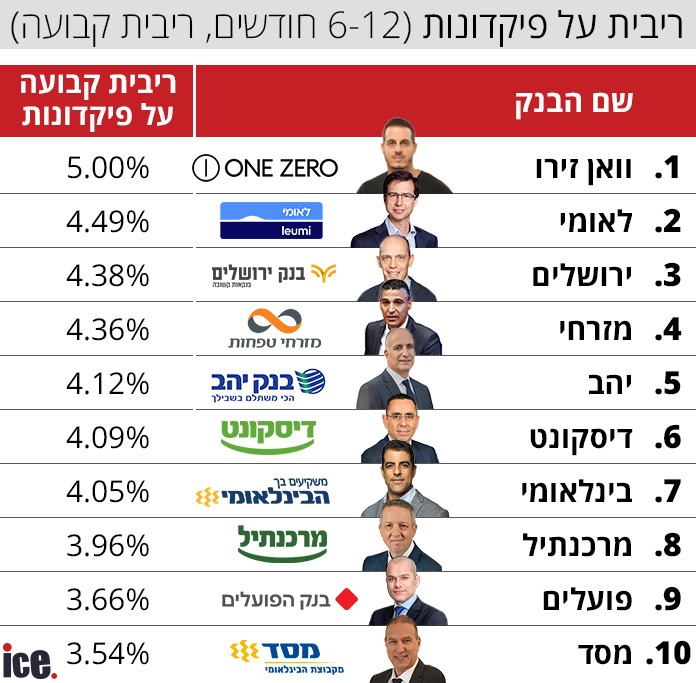 כפי שאפשר לראות בטבלה, בנק וואן זירו מוביל עם 5% ריבית קבועה ל-6-12 חודשים, כשלאומי ובנק ירושלים, שבחודש שעבר סיימו באותו מקום בדיוק, מעניקים ריבית של 4.49% ו-4.38% בהתאמה. בנק מזרחי עם 4.36% ובנק יהב מעניק 4.12%. בתחתית הרשימה שני בנקים שמעניקים ריבית של פחות מ-4%, זאת למרות הריבית הגבוהה במשק. הראשון הוא בנק מרכנתיל, עם 3.96%. במקום האחרון בנק מסד שמעניק ריבית של 3.54% בלבד.