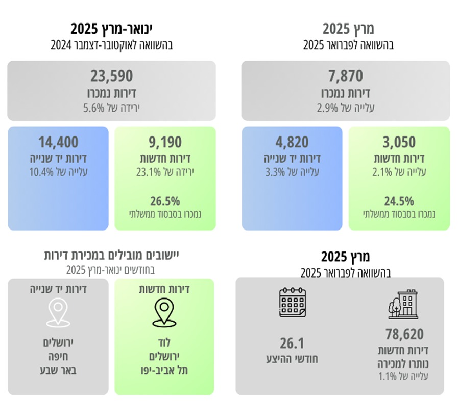 מה עוד אפשר לדעת על הדירות החדשות? ש-3,050 מהדירות שנמכרו בחודש מרץ הן דירות חדשות, עלייה של 2.1% לעומת פברואר 2025, ואילו בניכוי עונתיות ירידה של 8.1%. בהשוואה למרץ 2024, נצפתה מגמת ירידה של 23.1%. כלומר, אפשר להסיק מהנתונים שהירידה הגדולה התרחשה בינואר-פברואר, וזה לא מפתיע בשל הזינוק שהיה כאן בדצמבר. 4,820 מהדירות שנמכרו במרץ 2025 הן דירות יד שנייה, עלייה של 3.3% לעומת פברואר 2025, ואילו בניכוי עונתיות מגמת ירידה של 7.0%.