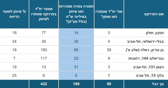 מה עוד חדש? החברה החלה לשווק גם את הפרויקטים ברחובות בלוך וויצמן ולפי הדוח המחיר הממוצע למ"ר יעמוד על כ-62 אלף שקל למ"ר. בבלוך נמכרה דירה אחת ב-6 מיליון שקל. בויצמן נמכרו 3 דירות במחיר ממוצע של מעל 10 מיליון שקל, וסביר כי דירות היוקרה נמנו איתן.