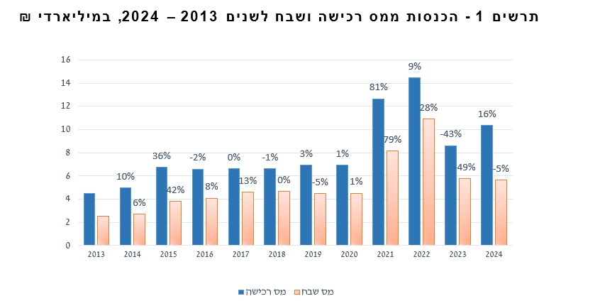 לפי נתוני הנספח שצורף לסקירה, אפשר ללמוד כי הכנסות ממיסי מקרקעין (בניכוי החזרים) הסתכמו בשנת 2024 ב- 15.9 מיליארד שקל, לאחר שבשנת 2023 הגיעו ל- 14.4 מיליארד שקל. מתוכן כשני שליש הן הכנסות ממס רכישה - 10.3 מיליארד שקל בשנת 2024 והיתר, 5.6 מיליארד שקל נגבו ממס שבח.