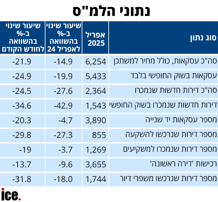 ומה קורה בעסקאות הנדל"ן? שם עדיין נרשמת ירידה. בחודש אפריל נרכשו 6,254 דירות, כולל דירות בסבסוד ממשלתי - ירידה של 15% בהשוואה לאפריל אשתקד ואחת הרמות הנמוכות שנרשמו בחודשי אפריל מאז תחילת שנות האלפיים, בפרט במכירות בשוק החופשי. בניכוי המכירות בסבסוד ממשלתי עמד מספר העסקאות בחודש אפריל השנה על 5,433 דירות, ירידה של 20% בהשוואה לאפריל אשתקד.