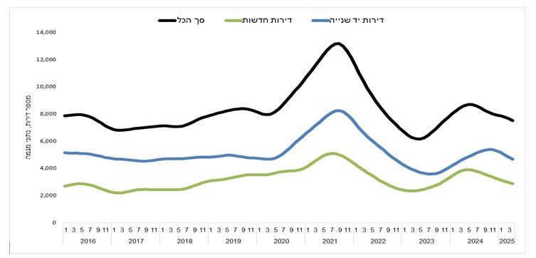 מה עוד מראים הנתונים? בחינת נתוני המגמה של סך הדירות שנמכרו מראה כי מחודש אוקטובר 2021 עד חודש מאי 2023 נרשמה ירידה בקצב של 3.7% בממוצע בסך הדירות שנמכרו. לעומת זאת, מחודש יוני 2023 עד מאי 2024 נרשמה עלייה בקצב של 2.9% בממוצע בסך הדירות שנמכרו. מחודש יוני 2024 עד אפריל 2025 המגמה מתהפכת ונצפית ירידה חודשית ממוצעת של 1.3%. מבחינת המגמה של סך הדירות החדשות שנמכרו, עולה כי מחודש אוגוסט 2021 עד מרץ 2023 נצפתה ירידה ממוצעת של 3.8%, ואילו מחודש אפריל 2023 עד מאי 2024 נצפתה מגמה הפוכה עם עלייה של 3.8% בממוצע לחודש. מחודש יוני 2024 עד אפריל 2025 המגמה מתהפכת ונצפית ירידה של 2.7% בממוצע לחודש.