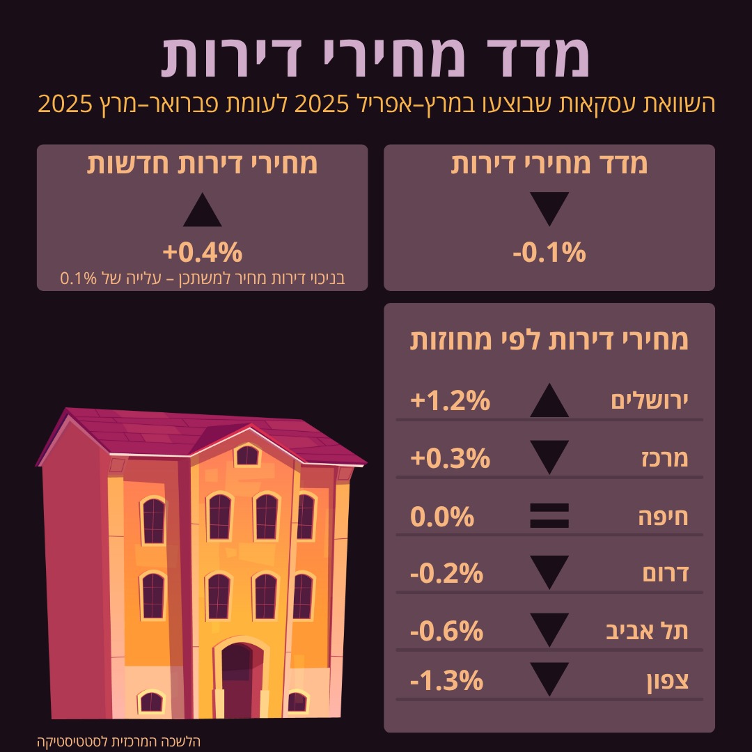 בחודשים מרץ – אפריל 2025, לעומת פברואר – מרץ 2025, נרשמו שינויי מחירים הבאים: ירושלים (1.2%), צפון (1.3%-), חיפה (0.0%), מרכז (0.3%), תל אביב (0.6%-) ודרום (0.2%-).