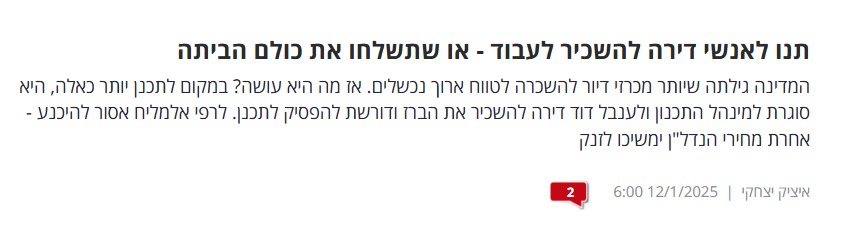 בטור מיוחד שהתפרסם כאן בחודש ינואר, תחת הכותרת "תנו לאנשי דירה להשכיר לעבוד - או שתשלחו את כולם הביתה" נכתב כי המדינה סוגרת למינהל התכנון ולענבל דוד דירה להשכיר את הברז ודורשת להפסיק לתכנן: "רפי אלמליח חייב לצאת ולהגן על הכבוד האחרון שנשאר לפרויקט דירה להשכיר מהמהלך הזה, ולמינהל עצמו, שיודע שהוא יורה לעצמו ברגל אם הוא מפסיק לתכנן דירה לשכירות ארוכת טווח".