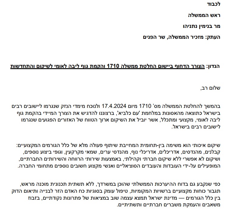 הם שיגרו הבוקר מכתב דחוף לראש הממשלה, בנימין נתניהו, בקריאה ליישום החלטת הממשלה 1710 מיום 17.4.2024, ולהקים באופן מיידי גוף ליבה לאומי לשיקום והתחדשות אזורים שנפגעו במהלך מלחמת "עם כלביא".
