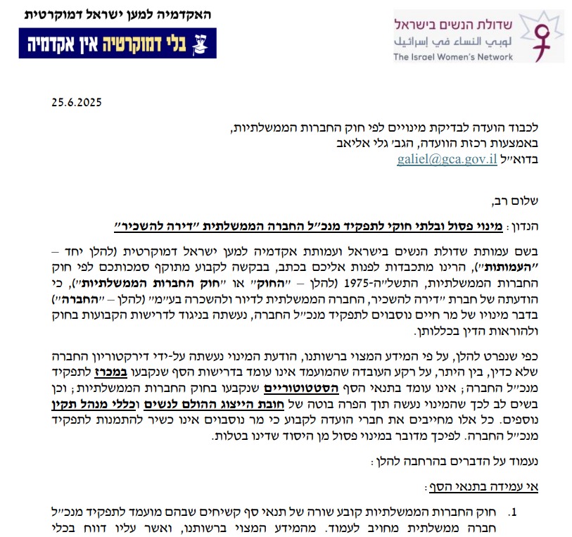 בהמשך להתנגדות למינויו של מנכ"ל דירה להשכיר וחסיד גור, עו"ד חיים נוסבוים, שדולת הנשים והאקדמיה למען ישראל דמוקרטית דורשות מרשות החברות ומשרד השיכון לבטל את המינוי. הסיבות: קרבה פוליטית וטענות להדחה של אשה בניגוד ל"בג"ץ המנכ"ליות". איך זה ייגמר?