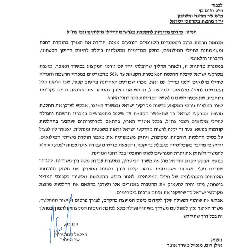 פנה לשר הבינוי והשיכון בדרישה לעדכן את מדיניות הקרקעות, כך שתתאפשר הקצאה של כל המגרשים במתכונת של הרשמה והגרלה רק לחיילי מילואים ולנכי צה"ל. המשמעות: מחוסרי דיור שאינם משרתים - בחוץ. כיצד הם יגיבו לבקשה והאם היא תאושר?