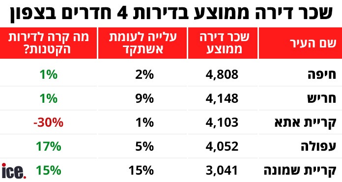מעניין היה לראות גם מה קורה בקריית שמונה החבולה. התושבים שפונו חזרו אליה ועתה הם מבקשים להתגורר בדירות חדשות ותקניות יותר. לכן קיימת בעיר נדידה מדירות השיכון הישנות וחסרות הממד לדירות חדשות ומרווחות בעלות הממד בשכונה החדשה בעיר. הדירות המבוקשות בעיר הן בנות 3-4 חדרים. דירות 2 חדרים, שבהם מתגוררים בד"כ סטודנטים עומד על 2,450 שקל, ירידה של 30%. אפשר להבין גם למה: הדירות הללו כבר לא משתמשות סטודנטים והן נטשו אותן בתחילת המלחמה. הירידה בביקוש הובילה לירידה דרסטית במחיר. בדירות בנות 3 חדרים, שכ"ד עומד על 2,633 שקל, ירידה של 17%. בדירות 4 חדרים, שכ"ד עומד על 3,041 שקל - עלייה של 15%. הסיבה לכך היא שבדירות הללו גרות משפחות, שחלקן חזרו לבתיהן.