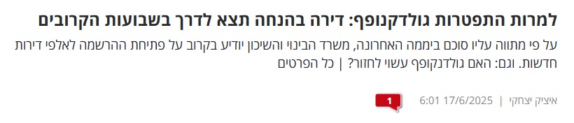 אחרי שאישור התכנית הוקפא בשל המלחמה עם איראן, תכנית דירה בהנחה אמורה להיות מאושרת במסגרת ישיבת מועצת רמ"י שתיערך ביום רביעי. המשמעות: אלפי דירות חדשות ישווקו לציבור הזכאים, עם עדיפות ברורה לחיילי מילואים. בשלב הראשון, כך נראה, ישווקו מספר דו ספרתי של דירות. ההערכה היא שכיום ישנן 11 אלף דירות בהנחה שמוכנות לשיווק, בעוד שלפחות 7,000 כאלה יהיו מוכנות בסבבים הבאים. בשלב הראשון, משרד הבינוי והשיכון מנסה לכלול כמה שיותר דירות באזורי ביקוש, משום שבקרוב התכנית תכלול רק ערי פריפריה וערים ומוגדרות באשכול נמוך.