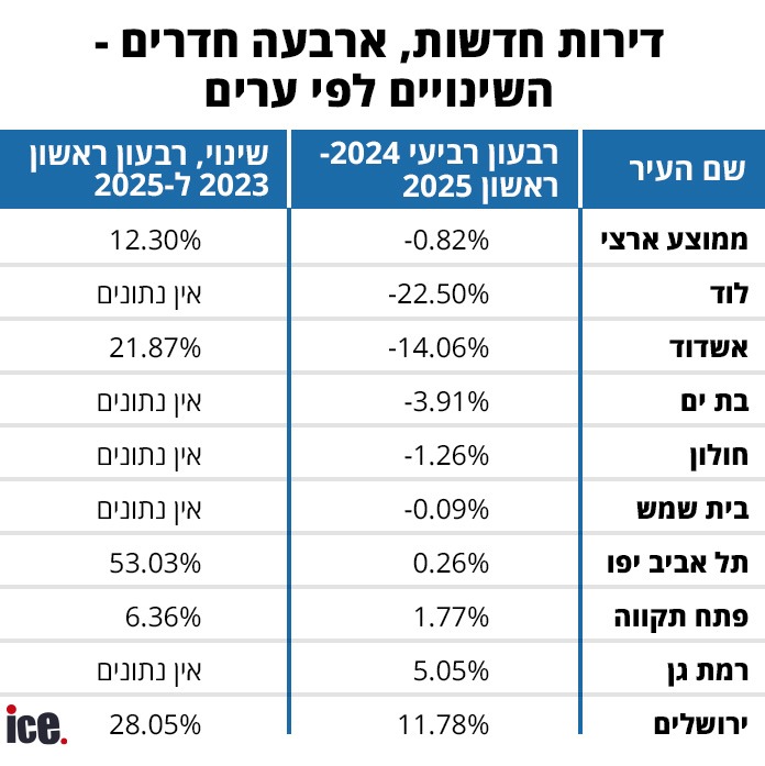 עוד אפשר לראות בטבלה, שגם אזורי אשדוד וירושלים חוו עליית מחירים דרמטית - כך לפי נתוני האתר. אם לוקחים את נתוני הרבעון האחרון של 2024, מקבלים דווקא ירידות מחירים בלוד ובאשדוד, בעוד שבתל אביב נרשמה יציבות יחסית. אי אפשר לייחס זאת, כמובן, לעלייה משמעותית במחירי הדירות בתחילת 2023, לכן המשמעות היא שהנתונים הושפעו בעיקר מנתוני 2024, בחסות מבצעי המימון של היזמים.
