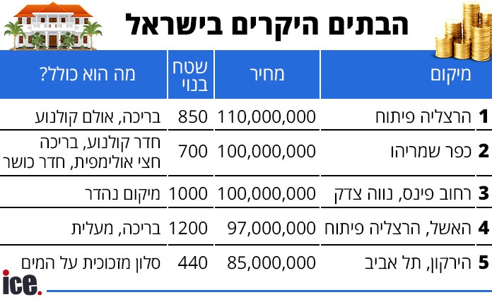 הבית היקר ביותר, שמוצע למכירה על ידי המתווך שחר מנדלסון, נמצא בהרצליה פיתוח וכמוהו גם הבית שמדורג רביעי ברשימה. אחריו בתים בכפר שמריהו ונווה צדק ולבסוף בית בירקון בתל אביב, ממש על הים. כפי שאפשר לראות בטבלה, המחירים מתחילים ב-85 מיליון שקל.