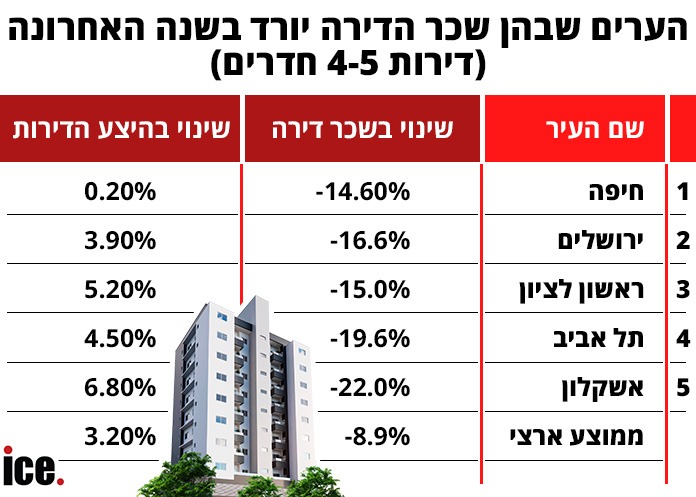 בדיקה מקיפה מעלה כי בחלק מהערים דמי השכירות דווקא יורדים. בעזרת נתוני חברת Wecheck בדקנו מיהן 5 הערים שבהן היצע הדירות קטן ועד כמה זה משפיע על שכר הדירה. 5 הערים שבהן שכר הדירה ירד בשנה האחרונה, ממאי 2024 למאי 2025 הן חיפה, ירושלים, ראשון לציון, תל אביב ואשקלון. שימו לב כי ארבעה מאותן ערים הן ערים גדולות. לעומת זאת, בדקנו מה קרה לשכר הדירה באותן ערים.