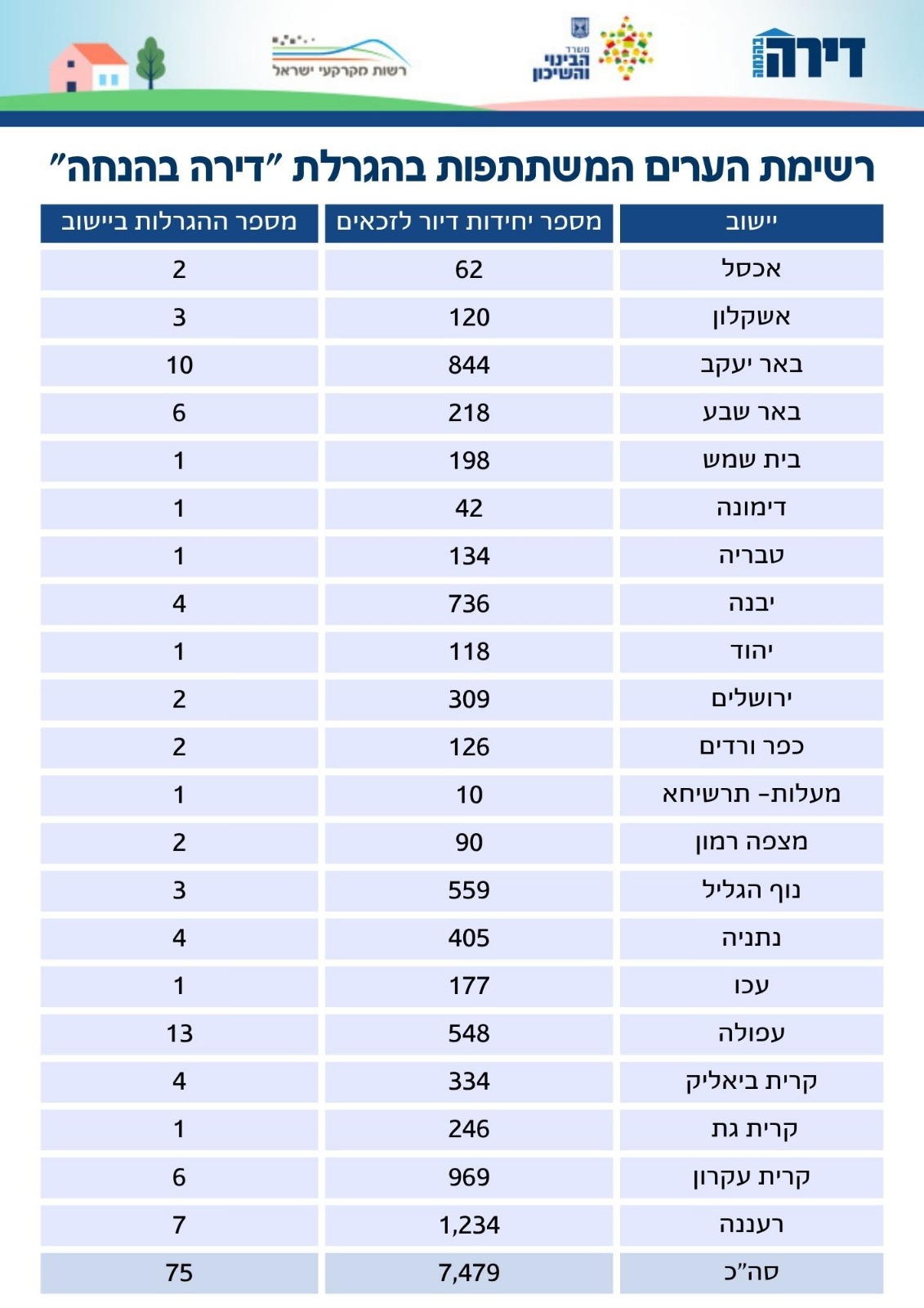 כפי שפורסם כאן בשבוע שעבר, במשרד הבינוי והשיכון החליטו להכליל את באר יעקב, נתניה (405) וירושלים (309), לפני שיפוג התוקף של התוכנית הקודמת. עוד ערים שיכללו בתוכנית: הן קריית ביאליק (334 דירות), קרית גת (246), באר שבע (218), בית שמש (198), עכו (177), טבריה (134), כפר ורדים (126), אשקלון (120), יהוד (118), מצפה רמון (90), אכסאל (62), דימונה (42) ומעלות (10).