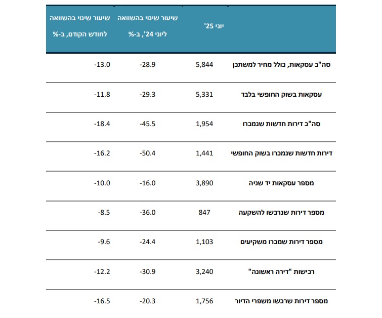 מה קרה לשוק הנדל"ן בחודש יוני והאם ההאטה נמשכת? שוק הדירות חווה טלטלה ביוני. זו לא רק המלחמה מול איראן שהשפיעה וגרמה למספר העסקאות לצנוח, אלא גם הריבית הגבוהה שמהדהדת ולא ברור האם היא אכן תרד פעמיים השנה, כפי שחלק מהכלכלנים חוזים, וכמובן - עסקת החטופים שבינתיים לא יוצאת לפועל ומשפיעה על סקטורים רבים בשוק, כולל הציפיות לצמיחה ושינויי הריבית.