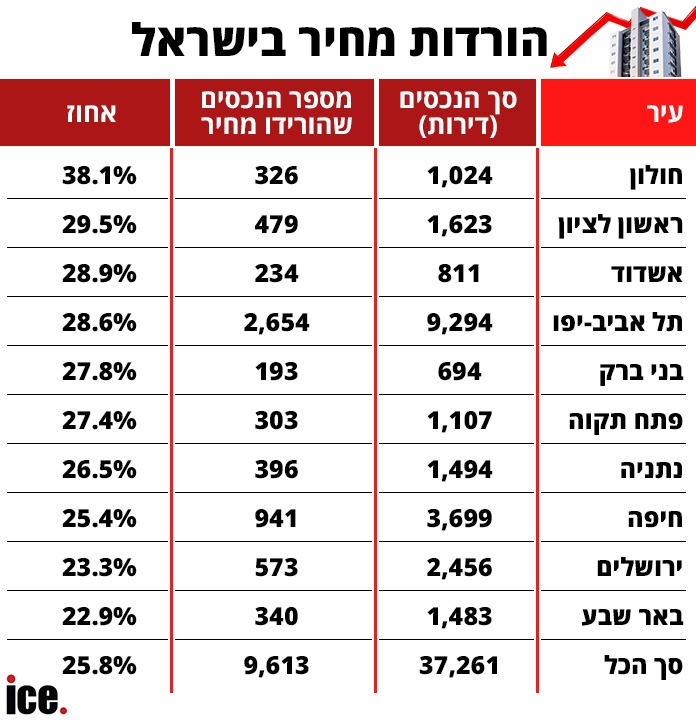ראשון לציון נמצאת מיד אחריה עם 30%. אחריהן אשדוד עם 29%, תל אביב-יפו עם 29%. שימו לב שלא תמצאו כמעט ירידות מחירים גדולות בפריפריה. הנתון באשדוד הוא חריג, אבל צריך לזכור: בשוק הישראלי המוכרים בדרך כלל מפרסמים מודעות עם מחיר גבוה משווי השוק, כי הם יודעים שהמשא ומתן הוא קשוח.