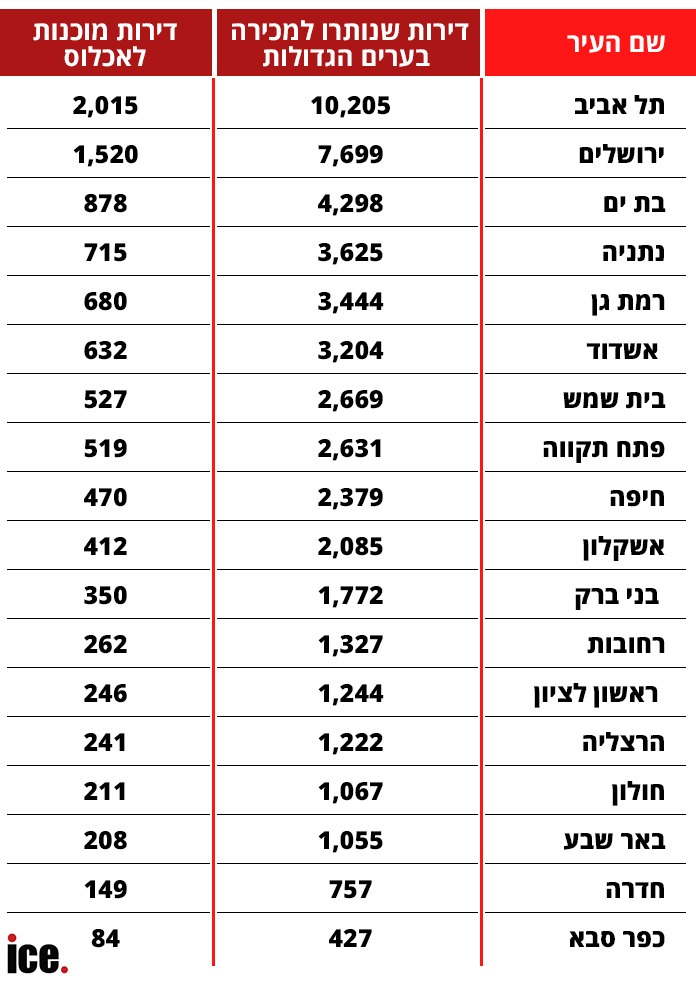 לפי הסקירה שלה, ב-2020-2021, כשהמחירים היו רגע לפני התפרצות גדולה, הפער עמד על 8,000 כאלה. היום הוא עומד על 25,000. מספר הדירות הלא מכורות בישראל עומד על 81 אלף, אבל בחלוקה לפי ערים, אפשר לראות שהמסה המרכזית היא בתל אביב. לפי אנשי המקצוע, מספר הדירות המוכנות בכל עיר עומד על קצת פחות מחמישית. לקחנו את הנתון הזה ובדקנו כמה דירות לא מכורות נותרו בכל עיר וכמה דירות ריקות מתוכן, על פי הערכות אנשי המקצוע, נותרו ריקות.