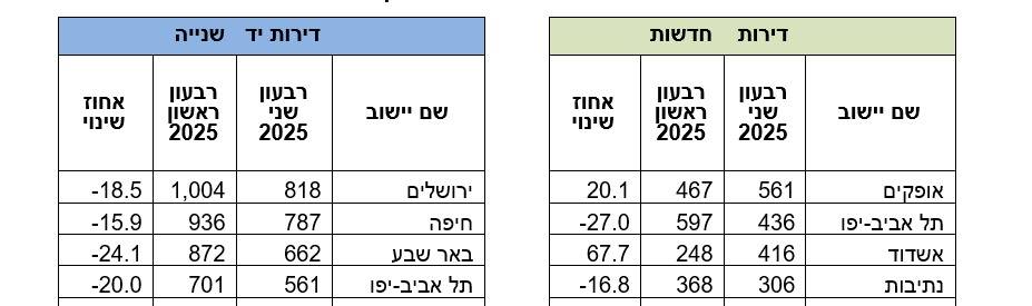 למי שתהה מה קרה ברבעון השני בתל אביב מול הראשון, אז ככה: ברבעון השני של 2025 נמכרו 436 דירות חדשות, לעומת 597 דירות ברבעון הראשון - ירידה של 27%. בשוק הירד השנייה נרשמה ירידה קטנה יותר, של 20% - 561 דירות בלבד, לעומת 701 דירות ברבעון הראשון. כאן למעלה, אפשר לראות את 4 הערים המובילים במכירת דירות חדשות ויד שנייה. תל אביב, למרות שנפגעה, ניצבת שנייה במכירת דירות חדשות. יחד עם זאת, בהתאם לגודלה, מדובר בנתונים נמוכים מאוד, שהגיעו בין היתר בשל עצירת העסקאות ביוני.