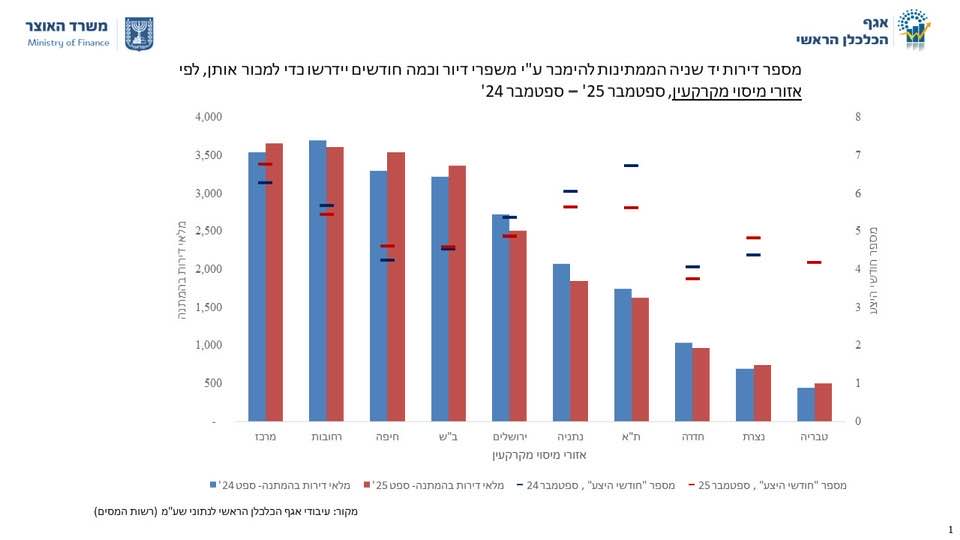 מסקירת האוצר עולה כי השכיחות הגבוהה ביותר של דירות בהמתנה היא דווקא באזור המרכז, זאת בניגוד לשנים עברו, בהן אזורי הדרום וחיפה "שלטו" בתחום. בן נאים שאלה כמה זמן יקח בכל אזור למכור את המלאי, בקצב המכירות הנוכחי של דירות יד שניה. לפי הנתונים, יש מלאי מספיק של יותר מחצי שנה באזור המרכז וקרוב לחצי שנה בתל אביב והשרון, כשבמקביל יש בשוק גם 46 אלף דירות חדשות (רובן לא מוכנות, אגב).