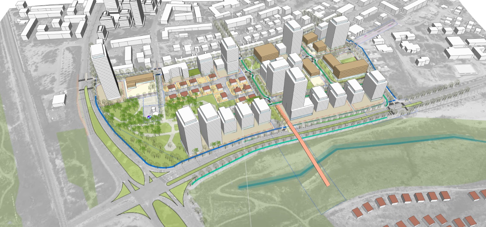 התוכנית כוללת 1,632 יחידות דיור שיוקמו ב-4 מתחמים במגוון סוגי בינוי: 9 מגדלי מגורים בגובה 14 עד 31 קומות לאורך שדרות רגר, לצד בניינים בני 8 עד 10 קומות, שישלבו חזיתות מסחריות פעילות לאורך שדרות רגר ורחוב סנהדרין. מתוך כלל יחידות הדיור, 352 יוקצו לטובת דירות קטנות עד 55 מ״ר וכן דיורית. כיום מצויים במתחם, 233 יחידות דיור ב-10 בניינים שיפונו לטובת הפרויקט החדש. בתוכנית יקבע מנגנון קרקע משלימה בשיתוף רשות מקרקעי ישראל.