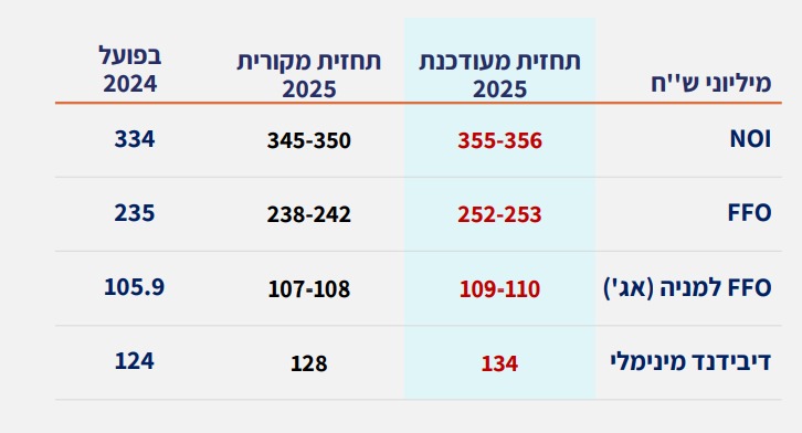 התחזית כוללת דיבידנד שנתי מינימלי של 134 מיליון שקל. ה-NOI עמד על כ-90 מיליון שקל ברבעון השלישי (עלייה של 6.3%), ה-FFO על כ-64.9 מיליון שקל (גידול של 11.1%) והרווח הנקי על כ-69 מיליון שקל - מה שמהווה זינוק ל-212 מיליון שקל מתחילת השנה (126 מיליון שקל אשתקד).