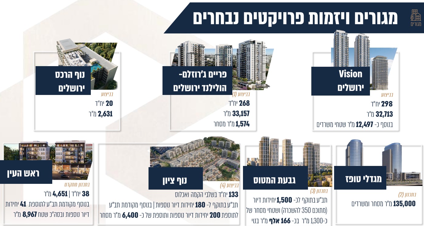 מלבד פרויקט אחד בראש העין, שוק המגורים של לוי מסתכם בירושלים, שם יש לחברה 7 פרויקטים. בתחום ההתחדשות העירונית, ללוי 6 פרויקטים - שניים בבת ים, והשאר בראשון לציון, בכפר סבא, ברמת גן ובחיפה. ללוי מספר פרויקטים של מגורים, אבל בעירוב שימושים, בין היתר ביהוד, בית שמש וברמת ישי.