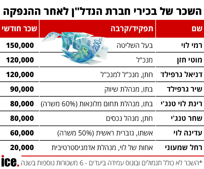 גם משפחת לוי תצא נשכרת. אשתו של רמי, עדינה, כך מתברר - תכהן ב-50% משרה בתפקיד גזברית ראשית, בתנאי תגמול הכוללים: שכר ברוטו בסך של 60 אלפי שקל, יחד עם תנאים סוציאליים ובונוס של 6 משכורות בכפוף לעמידה ביעדים. דניאל גרפילד, בעלה של בתו של רמי לוי, שיר גרפילד, המכהן כמשנה למנכ"ל ומנהל פיתוח עסקי, יקבל שכר גבוה יותר - במקום 17,600 שקל - 120 אלף שקל - כולל תנאים סוציאליים ובונוסים. ובכלל, גם בנותיו של לוי יתוגמלו.