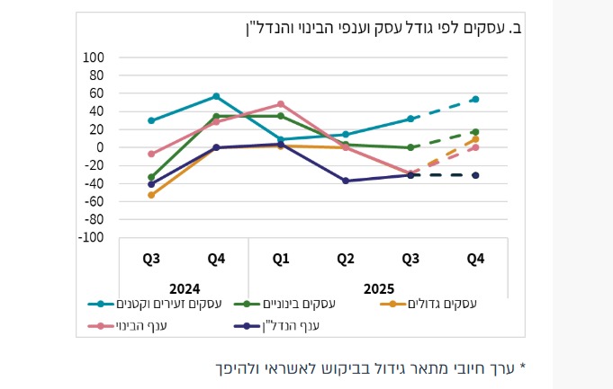 לפי הנתונים, ברבעון השלישי של 2025, בניגוד לגידול בביקוש לאשראי של העסקים הקטנים בישראל, חלה ירידה בביקוש לאשראי בענפי הנדל"ן והבינוי. לפי בנק ישראל, שימוש בחלופות מימון הוא הגורם המרכזי לירידה בביקוש לאשראי בענף הנדל"ן, אבל הוא לא ציין האם העלייה בחלופות המימון גוברת על הירידה בפנייה לבנקים. עם זאת, בנק ישראל צופה ירידה נוספת בביקוש לאשראי בענף הנדל"ן גם ברבעון הבא.
