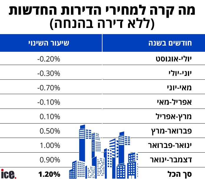 אספנו את כל הנתונים מתחילת השנה, כלומר מאז נתוני דצמבר-ינואר ועד נתוני יולי-אוגוסט, כלומר הנתונים האחרונים שפורסמו. התוצאה לא פשוטה לעיכול, לפחות עבור מי שסבר שמחירי הדירות החדשות בצניחה משמעותית.