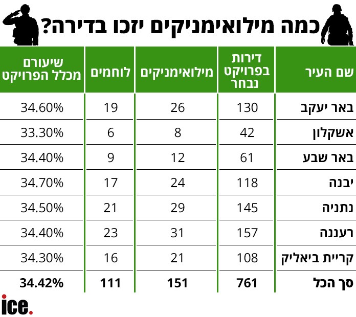 בדיקה שערך אתר ice במספר פרויקטים בערים נבחרות מגלה כמה מהזוכים יהיו חיילי מילואים וכמה מהם לוחמים. במשרד הבינוי והשיכון הבטיחו כי עד 50% מהדירות יוגרלו עבור משרתי מילואים, מתוכם 25% למערך הלוחם - אבל האם הערכים קרובים יותר ל-50% או רחוקים ממנו?