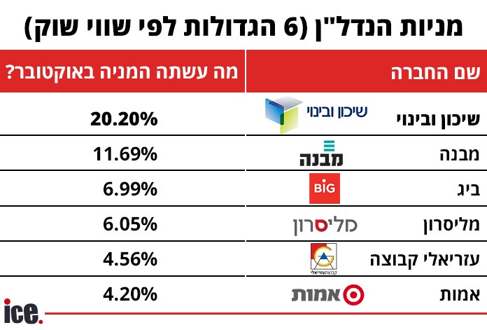 כל 6 חברות הנדל"ן הגדולות (לפי שווי שוק) רשמו עלייה בחודש האחרון. ביג עלתה בחודש שעברה ב-5.5% וזה היה נחשב ל"הישג" אחרי הירידות באוגוסט, אבל החודש היא עלתה בכ-7%. שיכון ובינוי, שסיימה ראשונה גם במדד הבנייה, עדיין ללא מתחרות - עם עלייה של מעל 20%. שאר החברות במדד הם מבנה, שעלתה בקרוב ל-12%, וכן מליסרון, עזריאלי ואמות, שעלו גם הן בשיעור חד ספרתי.