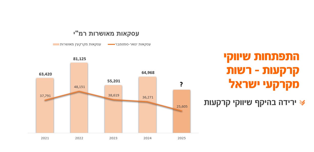 האם רשות מקרקעי ישראל עומדת לקראת שנת בצורת בחתימה על הסכמי שיווק עם יזמים? על פי בדיקה שנערכה בימים האחרונים - היקף שיווקי הקרקעות בשנת 2025 נמצא בירידה לעומת כל אחת מחמש השנים האחרונות.