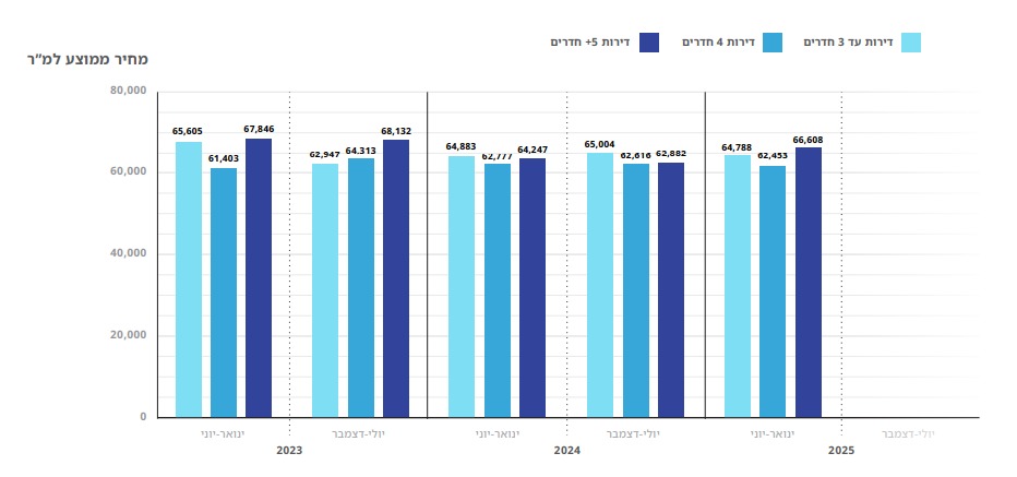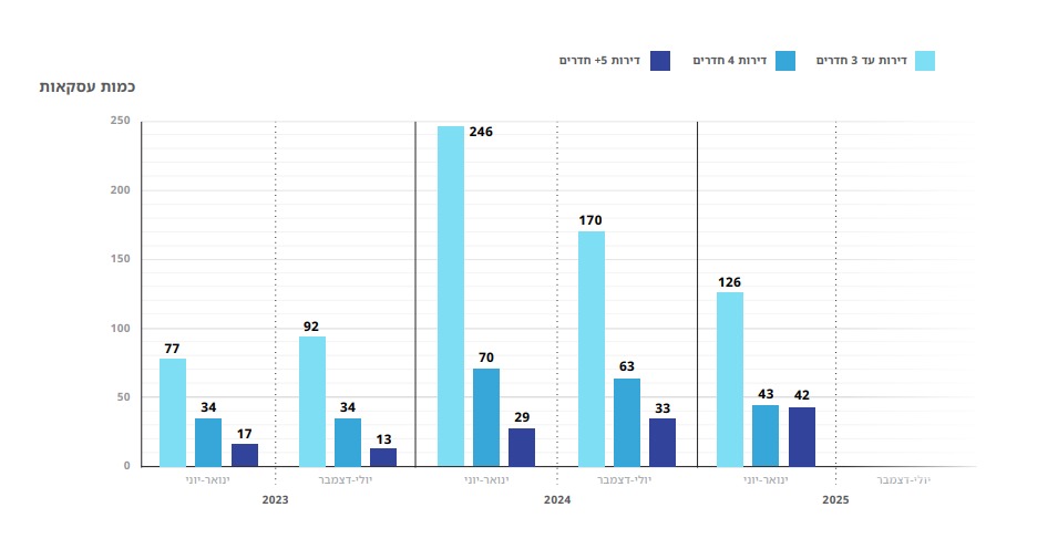 בפלח דירות 4 חדרים, הסיפור שונה. אצל שוק המשפחות ומשפרי הדיור - נרשמה עלייה מ-68 עסקאות ב-2023 ל-133 ב-2024 (96%), ולאחר מכן ירידה ל-43 ברבעון הראשון של 2025 (39%-). המחירים, כך נמצא בבדיקה, עומדים על 61,400 שקל למ"ר בתחילת 2023, 64,300 (4.7%) באמצע השנה, ויציבות סביב 62-63 אלף שקל למ"ר לאורך 2024 ו-2025, בהתאמה.
