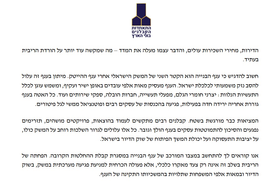 תחת הכותרת "השפעת הריבית הגבוהה על ענף הבנייה והצורך בהפחתתה בהחלטת הוועדה המוניטרית", כתב עמית גוטליב, סגן נשיא התאחדות הקבלנים ויו"ר ארגון הקבלנים והבונים בתל אביב והמרכז, שמשמש גם כיו"ר אגף כוח אדם, כלכלה ומיסוי בהתאחדות. "אנו פונים אליך בשעה רגישה במיוחד לענף הבנייה בישראל, על רקע ישיבת הוועדה המוניטרית הצפויה ביום שני הקרוב, אשר תקבע את גובה הריבית בחודשים הקרובים. הריבית הגבוהה הנהוגה כיום פוגעת באופן ישיר וחמור בענף הבנייה, שהוא מהענפים המרכזיים והמשמעותיים ביותר במשק הישראלי. הענף מחזיק חובות גדולים כלפי הבנקים והמוסדות הפיננסיים, והריבית הנוכחית יוצרת עומס כבד על תזרים המזומנים של החברות. מצב זה מכניס את הענף למיתון עמוק, פוגע ברווחיות, מוביל לעיכוב התחלות עבודה ומביא לירידה חדה בהתחלות הבנייה ברחבי הארץ".