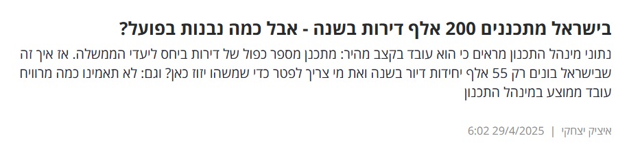 אבל משהו נופל בשרשרת הזו, עד שזה הופך לדירה. אתם מייצרים מספרים גבוהים והנתון היותר חשוב לא רק התחלות בנייה, אלא גמר בנייה. מדווחים לנו על 75 אלף התחלות בנייה, 70 אחרי קיצוץ דירות תמורה, ונתוני גמר הבנייה הם 50-55 אלף בשנה. מעט, לא?