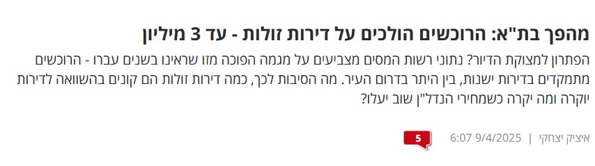 משהו נוסף קרה בימים האחרונים בשוק הנדל"ן - ירידת ריבית. שני הגורמים לבד לא יכולים לגרום להתפרצות ביקושים, אבל יחד, יש להם כוח כדי להוריד חלק מהמתעניינים מהגדר. גם בתל אביב השינוי יגיע. הוא איטי, הוא נראה רחוק, אבל הוא עשוי לקרות. רוצים לדעת עד כמה השוק בתל אביב מתעורר? אפשר להוכיח את זה בקלות דרך מספרים: לקחנו את העסקאות האחרונות בעיר מהמחצית השנייה של ספטמבר, אז דובר על אפשרות להחזרת החטופים וסיום המלחמה, ועד עכשיו.