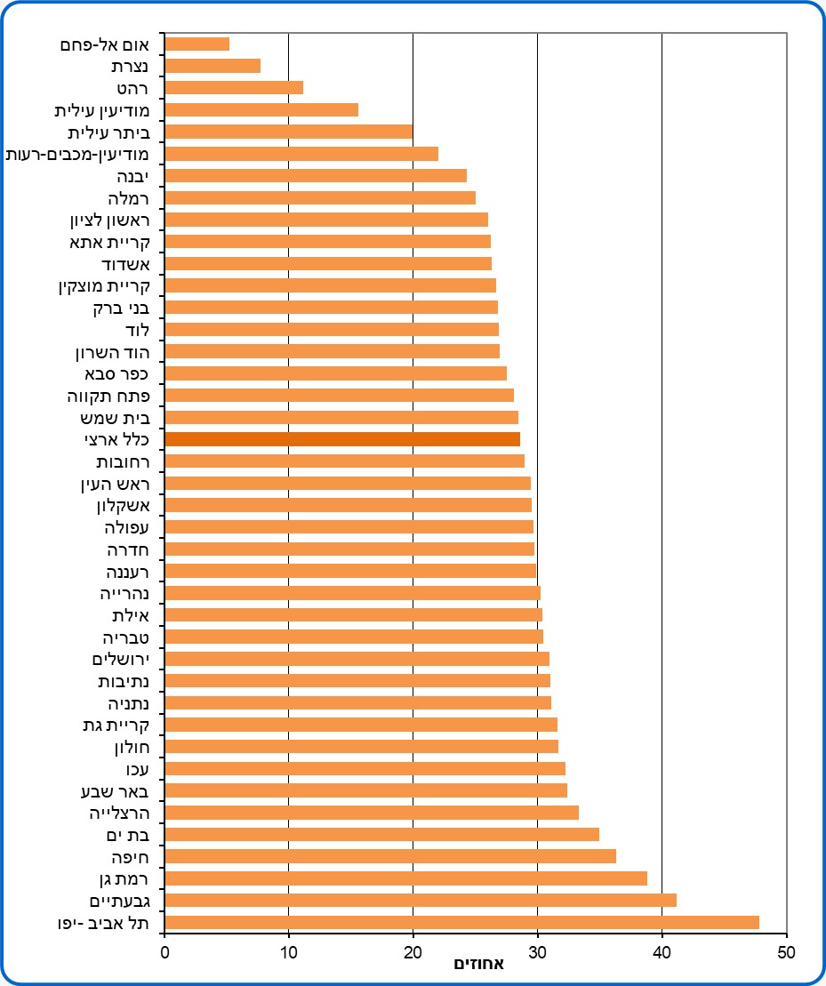 באילו ערים יש הכי הרבה שוכרי דירות בישראל והיכן אנשים מחזיקים בבעלות על דירה? בחינה שערכנו מתוך נתוני הלמ"ס מצביעה על כך ששלוש רשויות, ביניהן שתיים השייכות לפריפריה, מחזיקות במספר שיא של שוכרים. תל אביב נמצאת גם היא בשלישייה. מהנתונים עולה כי 29% הוא השיעור הממוצע של מגורים בשכירות בארץ - אך הנתונים מעודכנים כיום, שנתיים אחרי הסקר האחרון בנושא, עומד הממוצע על יותר מ-30%.
