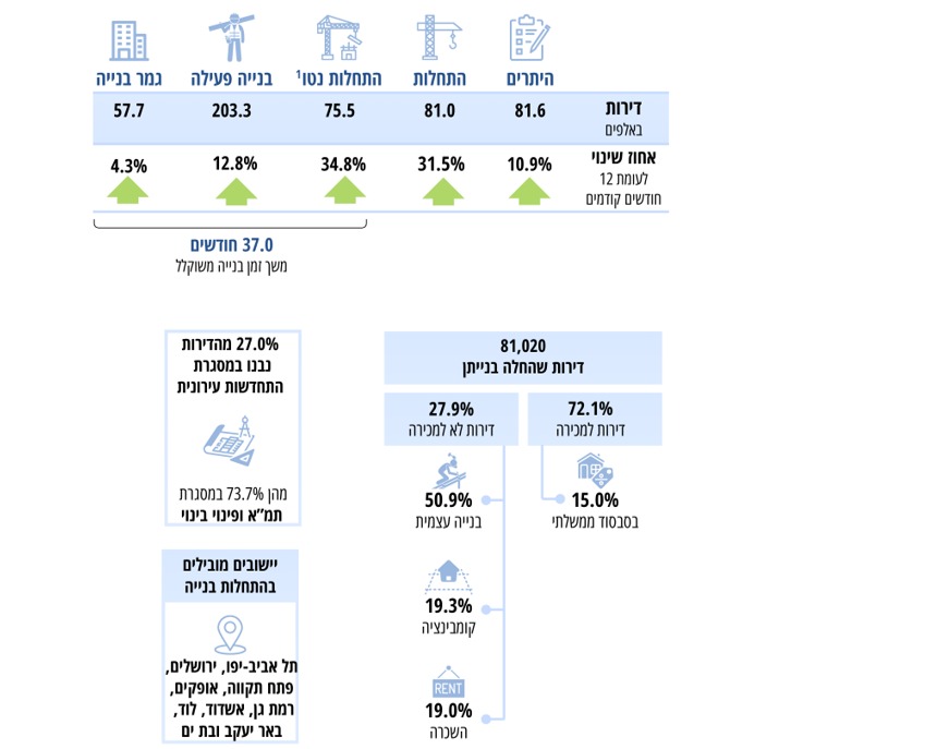 מה קובע את היצע הדיור בישראל? נתוני התחלות הבנייה הם חשובים מאוד, כי הם מעידים על הדירות שבדרך. בתחום הזה ישראל בעלייה. בשנה האחרונה נרשמה עליה של 31% בתחום זה, כשהתחלות הבנייה מזנקות ל-81 אלף דירות.