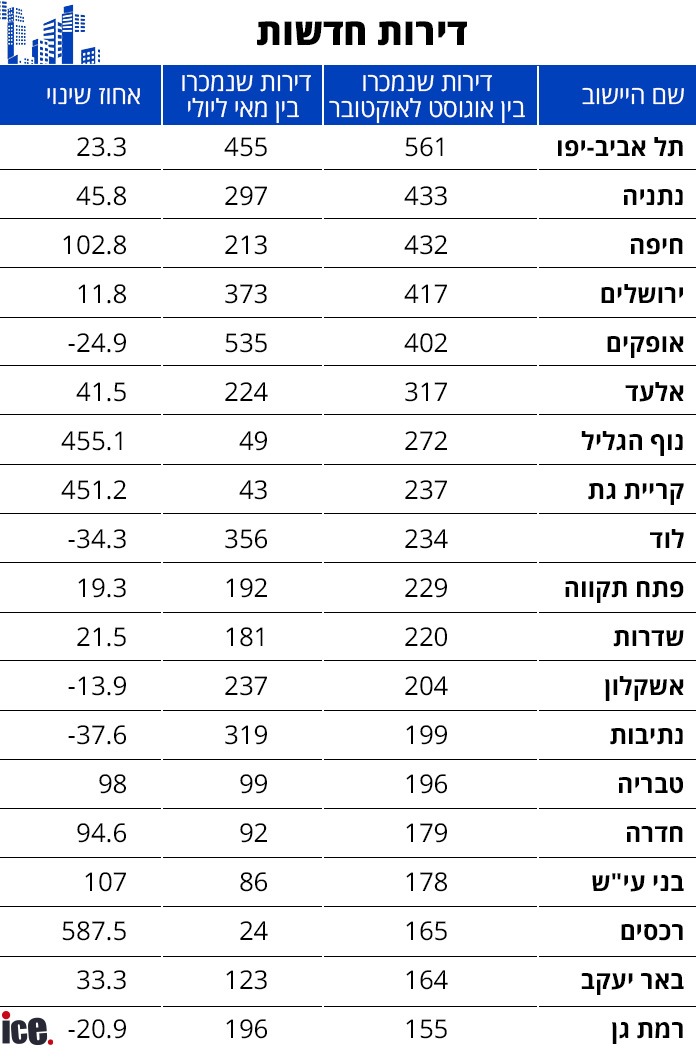 מבדיקה מול נתוני הלמ"ס בעיר תל אביב עולה כי 561 דירות חדשות נמכרו בשלושת החודשים האחרונים, לעומת 455 דירות חדשות שנמכרו בשלושת החודשים הקודמים. תל אביב מוליכה בענק את טבלת מכירת הדירות, אבל היא גם העיר הגדולה ביותר. נתניה שנייה, ושם נרשם זינוק של 45% במכירת דירות חדשות ל-433, גם בזכות תושבי החוץ. בחיפה, מספר הדירות החדשות שנמכרו הוכפל, מ-213 דירות במאי עד יולי עד כדי 432 דירות בשלושת החודשים שאחרי.