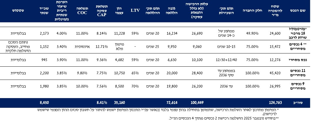 (צמוד למדד המחירים לצרכן בגרמניה בשיעור של 80%) עם הסכמי שכירות עד 30/06/2042, ללא אפשרות יציאה לפני תום תקופת השכירות. משקף תשואה לעסקה (CAP) של כ- 9.82%, תשואה שנתית ממוצעת C.O.C של כ- 11.31% ותשואה שנתית ממוצעת להון עצמי (.O.F.F) של כ- 16.64%.