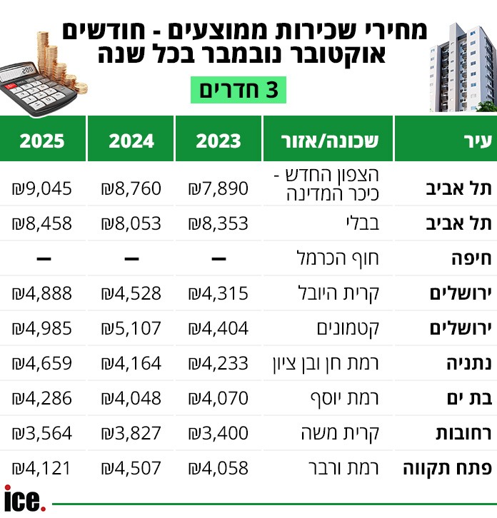 כפי שאפשר לראות כאן למעלה, מחירי השכירות בדירות 3 חדרים ירדו בשכונת הקטמונים בירושלים ובקריית משה ברחובות. גם ברמת ורבר בפתח תקוה נרשמה ירידה. בכל שאר השכונות, המחירים עלו בשנה האחרונה - כולל בצפון החדש ובשכונת בבלי, שם המחירים עלו בכ-300-400 שקל לחודש.