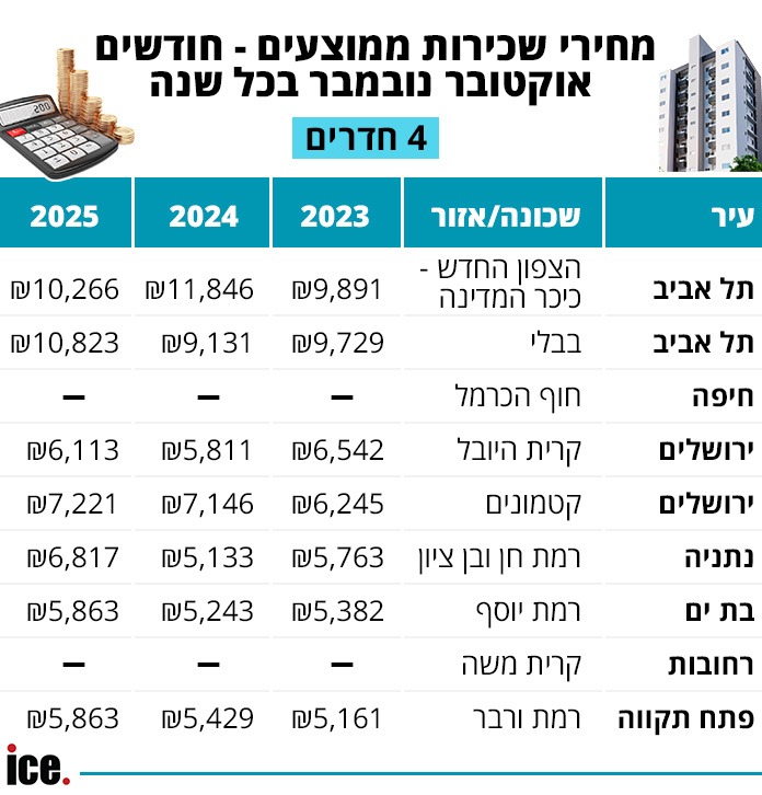 עלייה נוספת אפשר למצוא בקריית היובל בירושלים, שם המחיר הממוצע שירד ב-2024 עלה ל-6,113 שקל. קפיצה משמעותית יותר אפשר למצוא בשכונת רמת חן ובשכונת בן ציון בנתניה, שם המחיר הממוצע קפץ בכ-1,700 שקל בחודש בשנה החולפת.