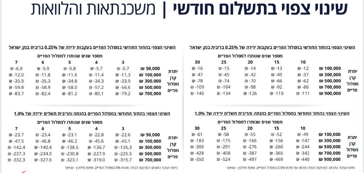 כרגע, בעקבות הפחתה של חצי אחוז בחודשיים האחרונים, ההחזר החודשי עבור משכנתא של 700-900 אלף שקל צמודה לפריים עומד על 200-300 שקל לחודש.
