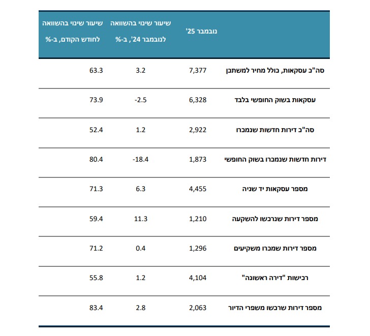 באוצר ציינו כי בהשוואה לרמה הנמוכה במיוחד שנרשמה בחודש הקודם, בין היתר על רקע חגי תשרי, מדובר בגידול של 63%. הם מוסיפים בניכוי המכירות בסבסוד ממשלתי שהיו גבוהות יחסית, הסתכם מספר העסקאות בשוק החופשי בחודש נובמבר ב-6,328 דירות, ירידה של 3% בהשוואה לנובמבר 2024 וגידול של 74% בהשוואה לחודש הקודם.