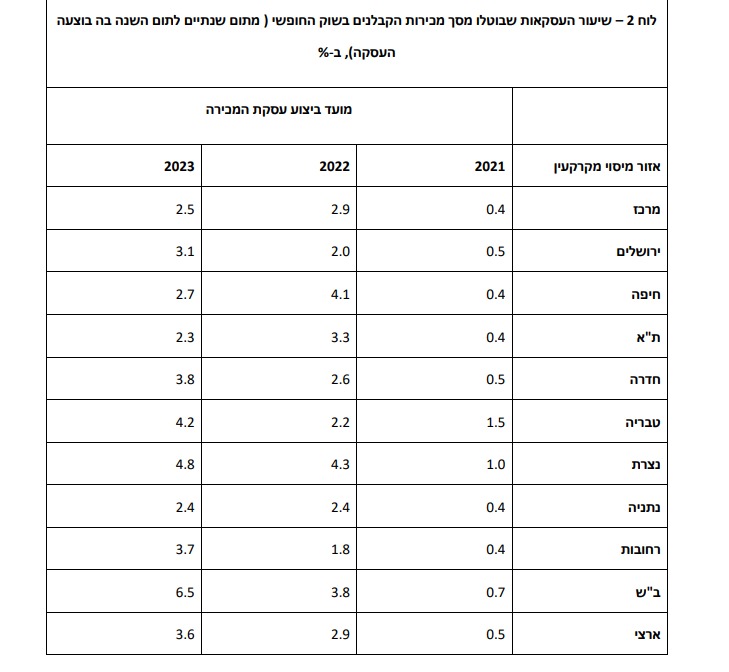 הטבלה המצורפת כאן מציגה כמה עסקאות בוטלו בין השנים 2021-2023. היא מצביעה בפירוש על עלייה ב-2023, אבל נזכיר כי ההגבלות על מבצעי המימון נכנסו לתוקף במרץ 2025 והריבית החלה לעלות באפריל 2022. אפשר לראות שבאזור המרכז שיעור הביטולים דווקא ירד, בעוד שבפריפריה הוא עלה. בבאר שבע נרשם שיעורים הביטולים הגבוה ביותר. בנתניה, תל אביב, חיפה וכאמור גם במרכז, ערים חזקות יותר, שיעור הביטולים היה נמוך יותר.
