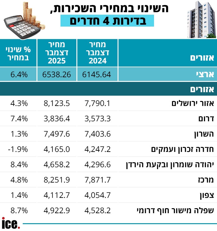 בעזרת נתוני יד2 לסיכום שנת 2025, בדקנו מה קרה למחירי השכירות באזורים השונים בישראל והאם יש אזורים שבהם כדאי יותר לשכור דירות כיום? התוצאה: בשנה האחרונה מחירי השכירות עלו ב-6.4%. דירה ממוצעת ששכרתם בדצמבר 2024 תמורת 6,145 שקל, תשלמו עליה היום 6,538 שקל - תוספת של כמעט 400 שקלים.