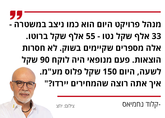 "אפילו 12%-11%. כמו שאמרתי קודם, היתרון שלנו הוא שאנחנו קבלני ביצוע, אז גם על עלויות העבודה אני מרוויח 10%. לכן, הרווח בכללותו גבוה יותר. אתה יודע כמה עולה מנהל פרויקט או מנהל עבודה? מנהל פרויקט היום הוא כמו ניצב בכיר במשטרה - 33 אלף שקל נטו - 55 אלף שקל ברוטו. אלה מספרים שקיימים בשוק שלנו. לא חסרות הוצאות. פעם מנופאי היה לוקח 90 שקל לשעה, היום 150 שקל פלוס מע"מ. איך אתה רוצה שהמחירים יירדו?".